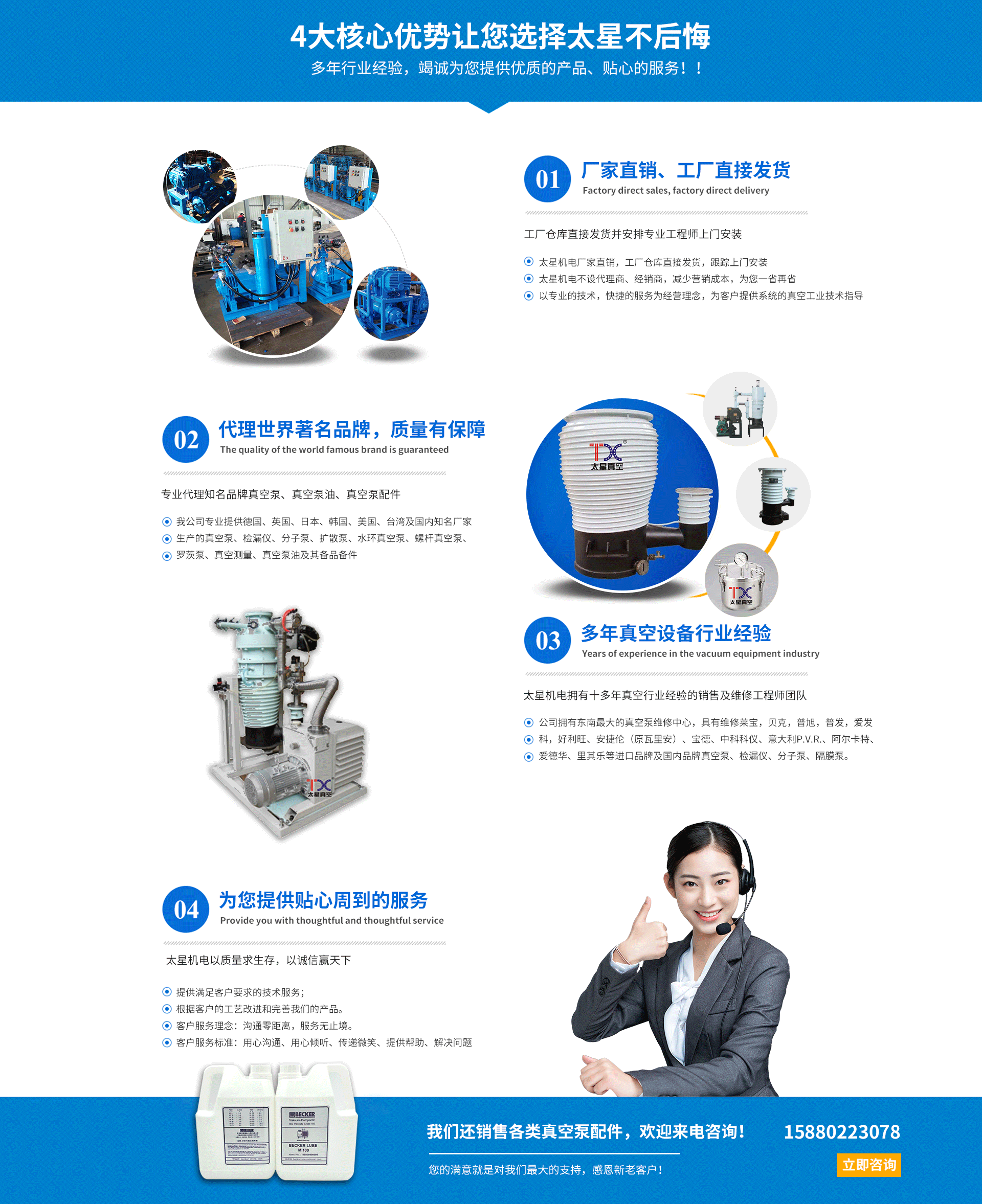 廈門太星機電有限公司于2009年成立于廈門集美,是一家真空工業(yè)服務企業(yè)。廈門太星機電有限公司擁有一批技術維修團隊,在維修方面有精湛、豐富的技術經(jīng)驗,標準的維修車間,標準的維修工具,規(guī)范的作業(yè)流程。為客戶提供完善可靠的服務,以精致維修,價格合理,提升真空設備的使用價值。 廈門太星機電有限公司真空工業(yè)銷售和服務。以技術雄厚的服務能力廣受客戶的認可,應用于上百家客戶,提供了優(yōu)良的服務,應客戶需求定制價值高的真空工業(yè)解決方案。 主營范圍: 1、銷售真空泵、真空配件、真空泵油、耗材、真空部件; 維修保養(yǎng)干泵、分子泵、旋片泵、機械泵、羅茨泵、渦旋泵、氦質(zhì)譜檢漏儀、羅茨風機、隔膜泵、柱塞泵、水環(huán)泵、真空儀器、真空閥門等真空設備; 真空系統(tǒng)的定制、優(yōu)化、改造、升級。 真空系統(tǒng)檢漏服務; 非標真空工程的規(guī)劃、設計、施工、調(diào)試、培訓服務; 3D打印機及3D打印服務; 2、進口真空泵的銷售、維修和保養(yǎng)的一條龍服務,如Agilent安...